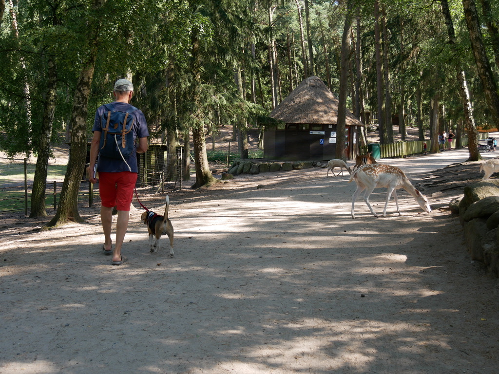 Nun wird es spannend: Ich hatte nicht wirklich damit gerechnet, dass Hunde mit ins Dammwild-Freigehege dürfen, aber tatsächlich ist das außerhalb der Brut- und Setzzeit kein Problem. Also wagen wir es und spazieren einfach so mit unserem Hund an der Leine mitten zwischen den Rehen durch. Das ist ein ziemlich cooles Gefühl, finde ich. Piet ist eher ängstlich, bellt aber auch nicht. Als Alternative für alle, die nicht durch das Freigehege gehen möchten oder dürfen, ist extra ein Hunde-Sinnespfad mit Duftstationen angelegt. Den findet Piet jedoch völlig unspektakulär.