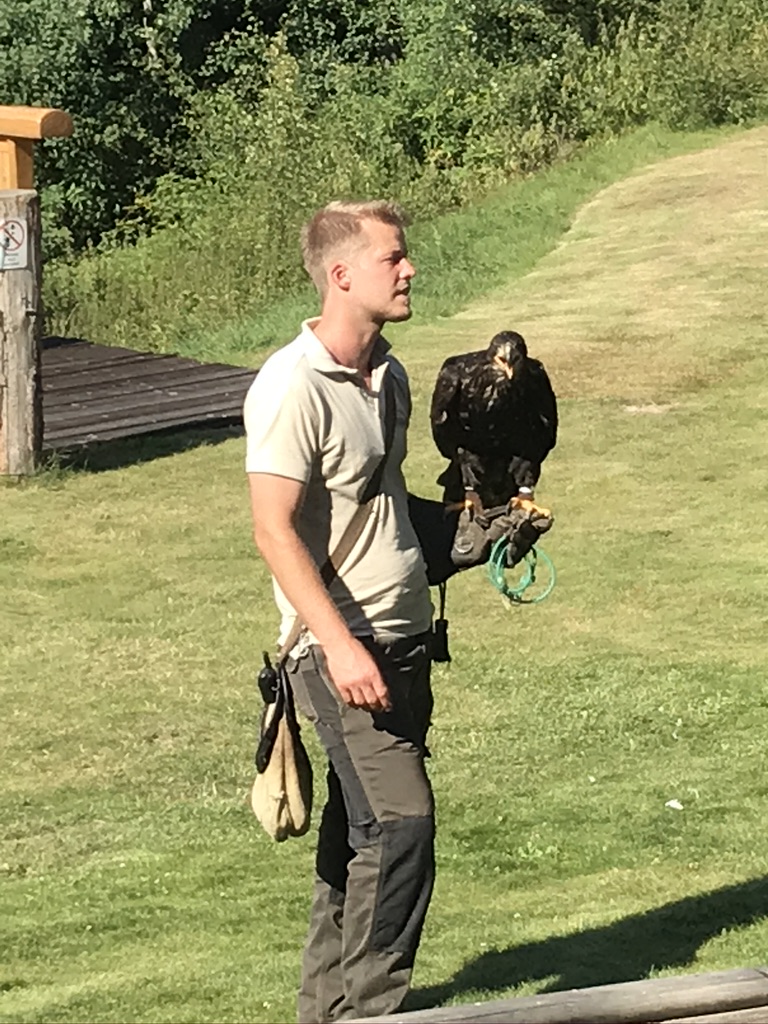 Kurz vor Ende verlässt mich mein Kamera-Akku – Anfängerfehler! Dabei gibt es bei den Greifvögeln noch einiges zu sehen. Flugvorstellungen finden zwar zurzeit – wie vieles andere – nicht statt, dennoch steht gerade ein Falkner mit einem Greifvogel auf der Wiese und beantwortet den Zuschauern, die auf den Tribünen Platz genommen haben, ihre Fragen. Auch hier heißt es jedoch für Hunde wieder: Abstand halten. Daher wurde eigens die Hunde-Loge eingerichtet, die etwas weiter entfernt ist vom Geschehen. Verständlich – wir wollen die Vögel ja nicht unnötig aufschrecken oder irritieren.