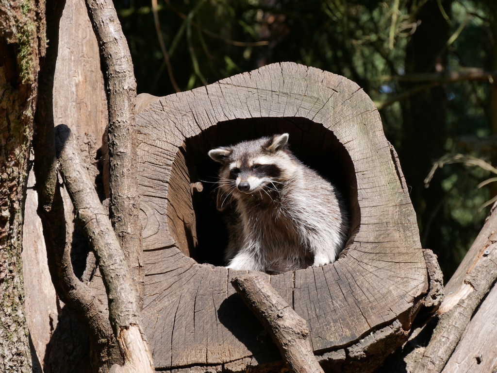 Die Präriehunde hingegen findet er besonders spannend – dabei sind sie nur dem Namen nach verwandt, denn es handelt sich um eine Gattung der Erdhörnchen. Die Lamas sind hier eindeutig die Tiere mit der coolsten Frisur. Auch das zweite Dammwild-Freigehege passieren wir ohne Probleme. Ein Waschbär zeigt sich kooperativ und krabbelt fotogen aus einem ausgehöhlten Baum.