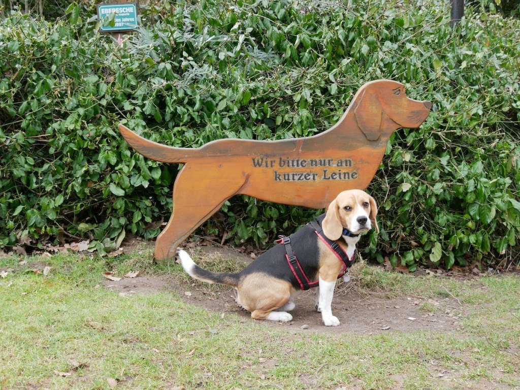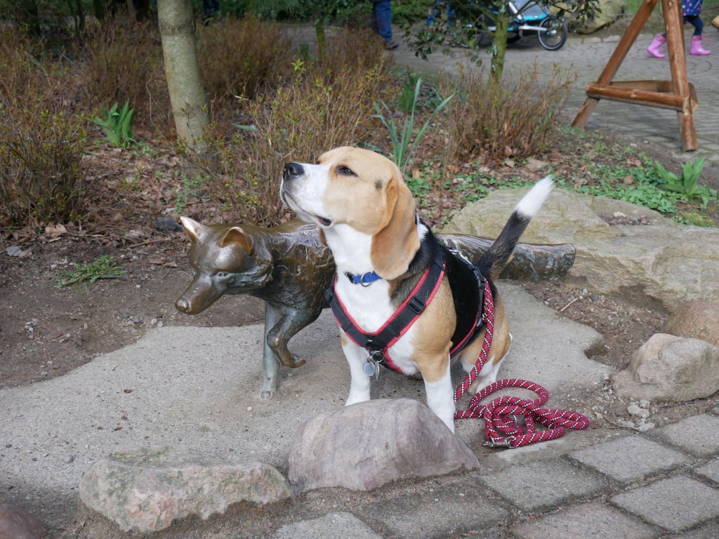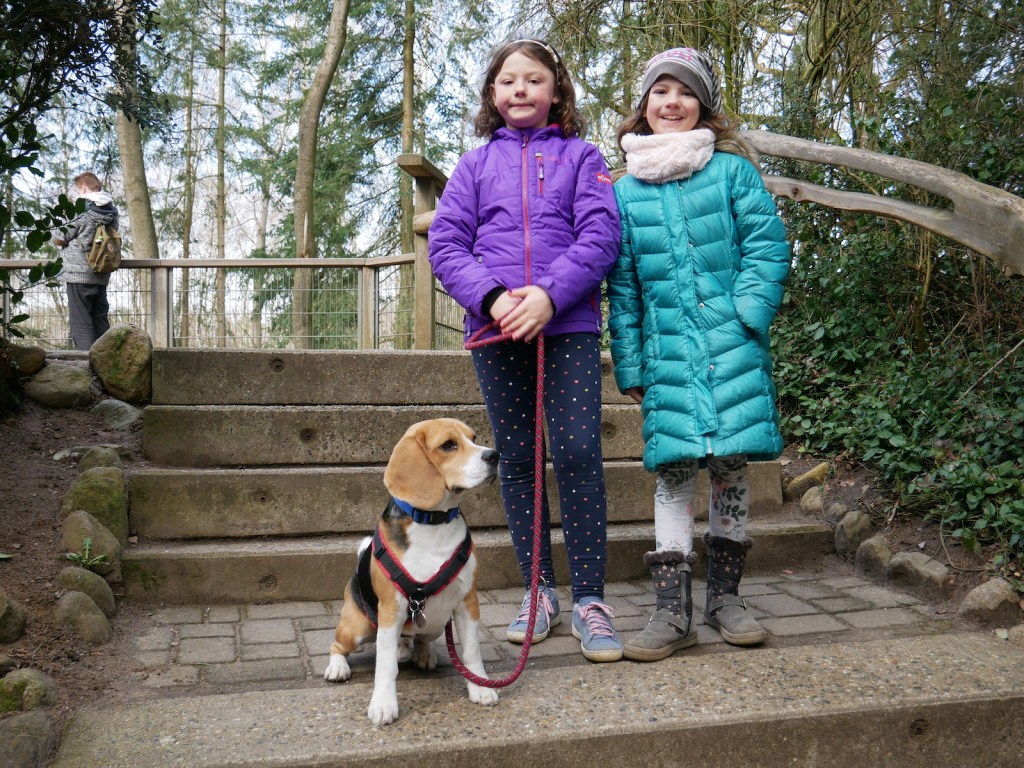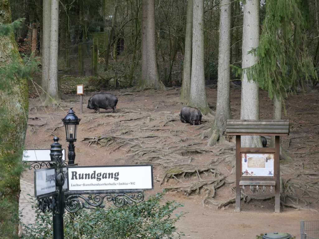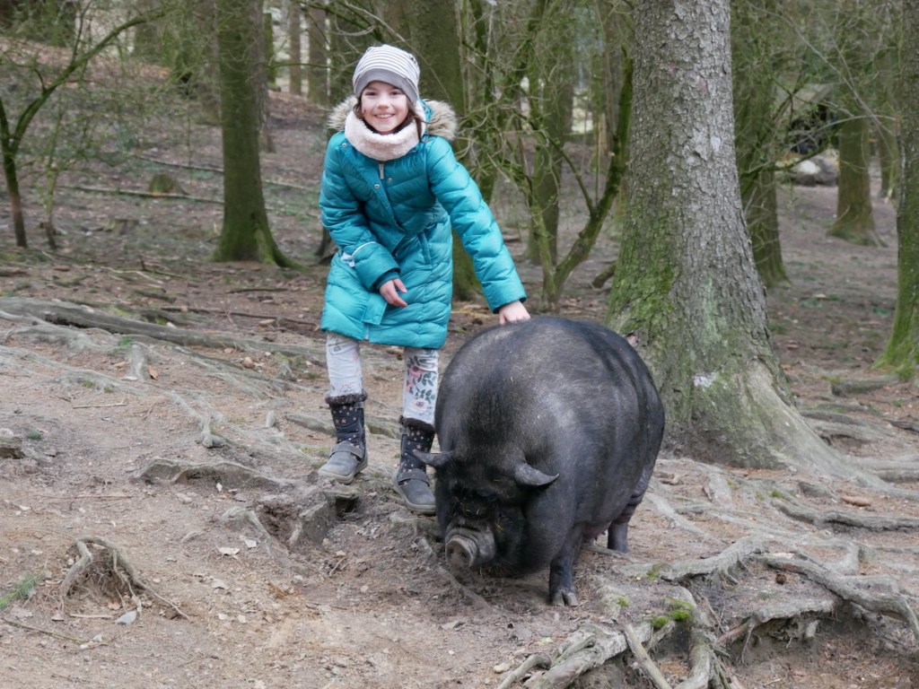 Gleich hinter dem Eingangsbereich wirst Du von den Hängebauchschweinen begrüßt, die sich frei auf diesem Teil des Geländes bewegen dürfen. Samira und Minou hatten keinerlei Berührungsängste, Piet hingegen war weniger begeistert. Dieser Bereich wird von Gitterrosten begrenzt, die von den Tieren nicht überquert werden können – das gilt allerdings auch für Hunde, zumindest bei der Pfotengröße eines Beagles, so dass wir Piet über die Gitter heben mussten.