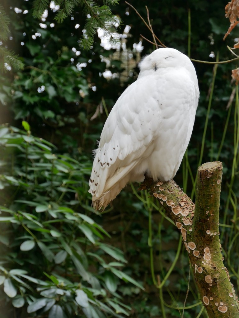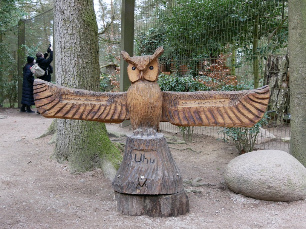 Um den Weg fortzusetzen, mussten wir uns hier aufteilen. Denn Piet darf das Freigehege (Eingang bei Nr. 27) nicht betreten. Das geschieht vor allem zu seiner eigenen Sicherheit, denn die Greifvögel könnten ihn leicht als Beute betrachten.
