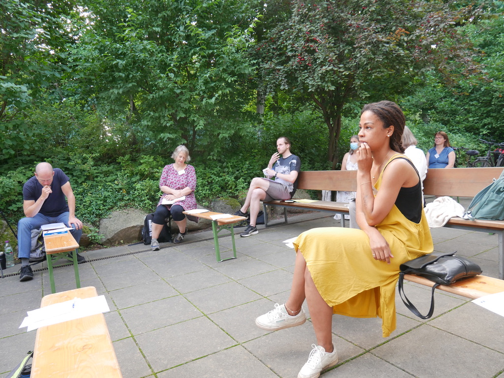 Doch schon nach dem ersten Treffen in der Kirche schlug das Virus wieder zu: Die explodierenden Coronazahlen Ende Juli bereiteten mir einige Kopfschmerzen und ein stressiges Wochenende. Doch die Entscheidung, nicht gleich wieder auf online zurückzugehen, sondern den Schwung des ersten Präsenztreffens mitzunehmen, war am Ende richtig. So kam es spontan zu unserem ersten Outdoor-Treffen im Pfarrgarten – auch hier gilt der besondere Dank wieder einmal Diakonin Antje Stoffregen! Das Wetter spielte zum Glück mit, na ja, fast…. Der Regen kam mit den Schlussworten, aber alle halfen schnell beim Zusammenpacken. Und im August wagten wir uns dann wieder in die Kirche. Ohne Impf-, Test- oder Genesungsnachweis geht es zwar derzeit nicht, aber das nehmen die Teilnehmer gerne in Kauf. Da das Heizen des Kirchengebäudes eine teure Angelegenheit ist, werden wir voraussichtlich ab Herbst in Räumlichkeiten im Gemeindehaus umziehen. Aber auch das soll keine Dauerlösung sein.