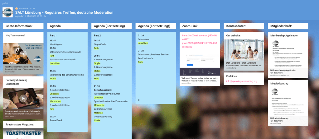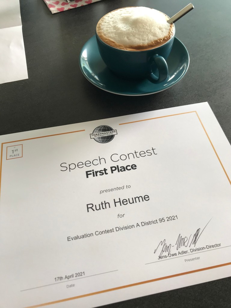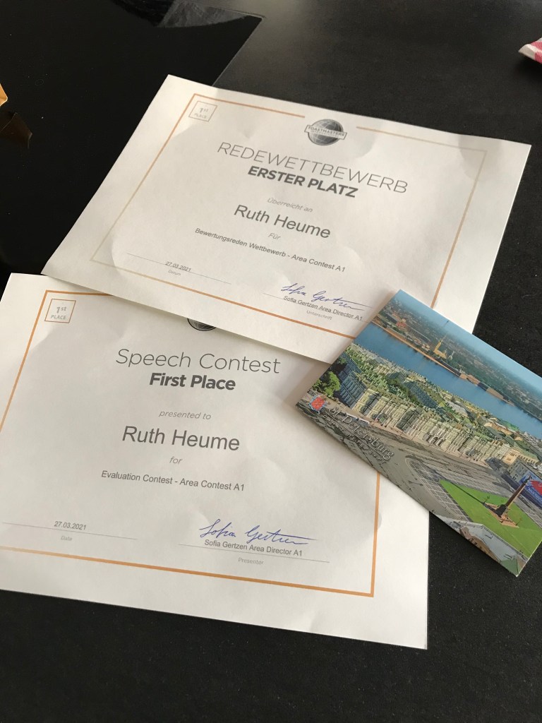 Im Frühjahr 2021 begann wieder die Zeit der Redewettbewerbe – selbstverständlich immer noch online – und dieses Mal wollte ich als Teilnehmerin dabei sein. In der Kategorie der Bewertungsreden schaffte ich es auf deutsch bis auf die Ebene der Division (Division A = alle Clubs in Norddeutschland), auf englisch sogar bis auf die Distrikt-Ebene (Distrikt 95 = Deutschland, Dänemark, Norwegen und Schweden). Und da muss es irgendwann wieder „klick“ gemacht haben. Pandemie hin, Pandemie her: wir starten doch online!