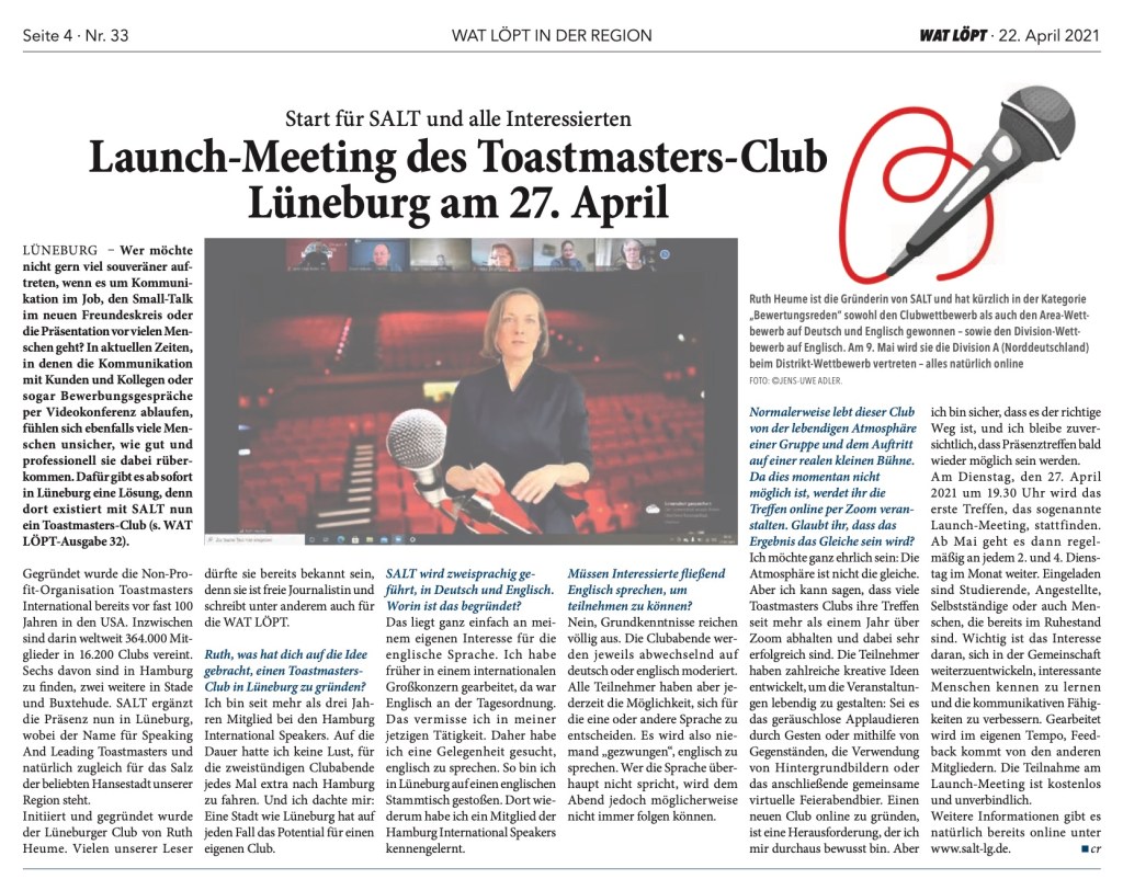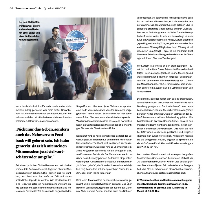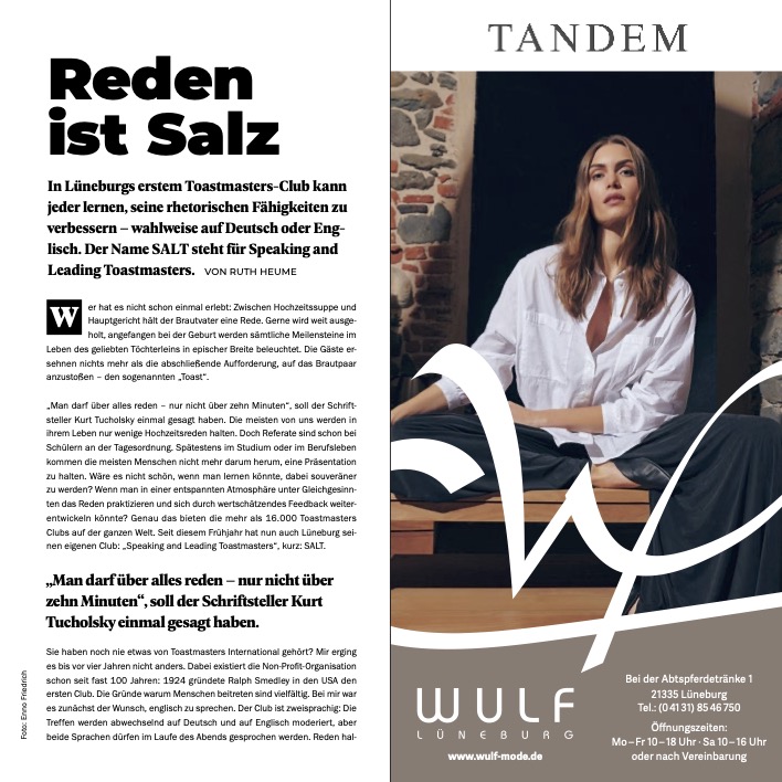 Erinnerst Du Dich? Im April 2020 habe ich an dieser Stelle einen Toast ausgesprochen: „Ein Toast auf die Hansestadt! – Warum Lüneburg unbedingt einen Rednerclub braucht.“ Und nun ist er da: Lüneburgs erster und bisher einziger Toastmasters Club ist im April 2021 an den Start gegangen! Und er trägt den Namen der Salzstadt: Speaking And Leading Toastmasters, kurz: SALT. Reden ist Silber, Schweigen ist Gold? Das gilt nicht für Toastmasters Clubs. Und schon gar nicht für uns. Was, Du kennst uns noch nicht? Dann wird es aber höchste Zeit!