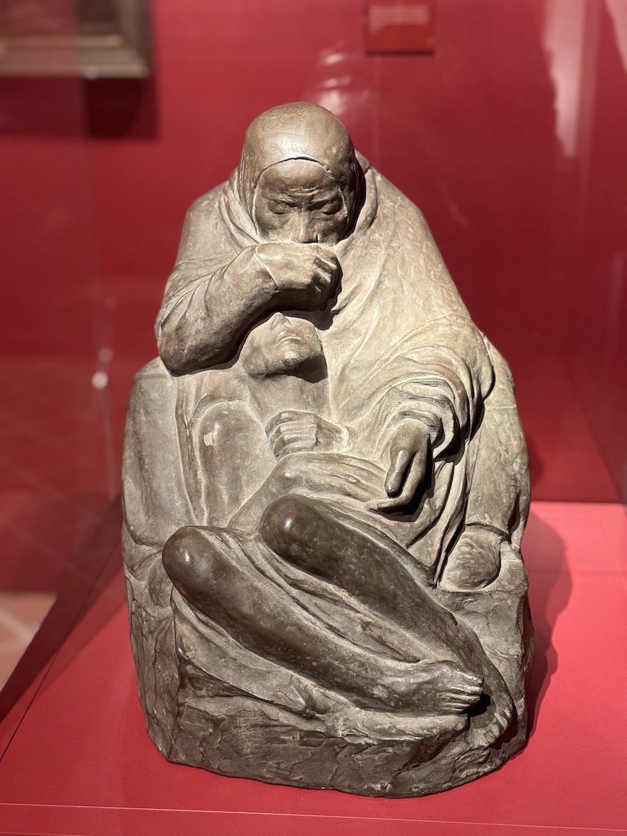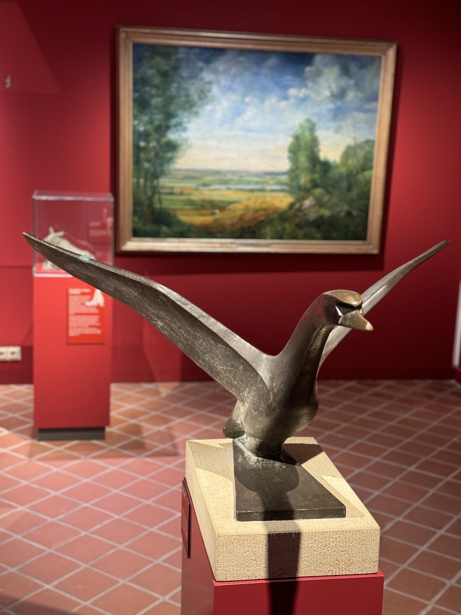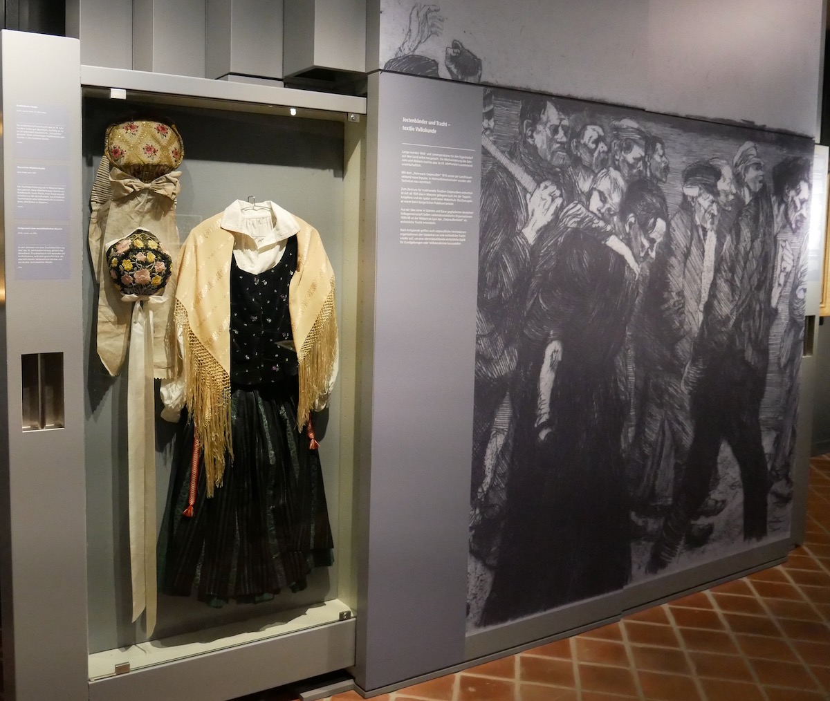 In der 1. Etage erwartet uns zunächst die bildende Kunst. Hier fällt sofort die „Pieta“, auf, eine Skulptur von Käthe Kollwitz. Mir gefällt besonders der „Auffliegende Schwan“ von Maria Ewel. Die Gemälde aus der Künstlerkolonie Nidden zeigen vor allem die typische Landschaft Ostpreußens. Gleich nebenan kann ich traditionelle Kleidungsstücke bestaunen.