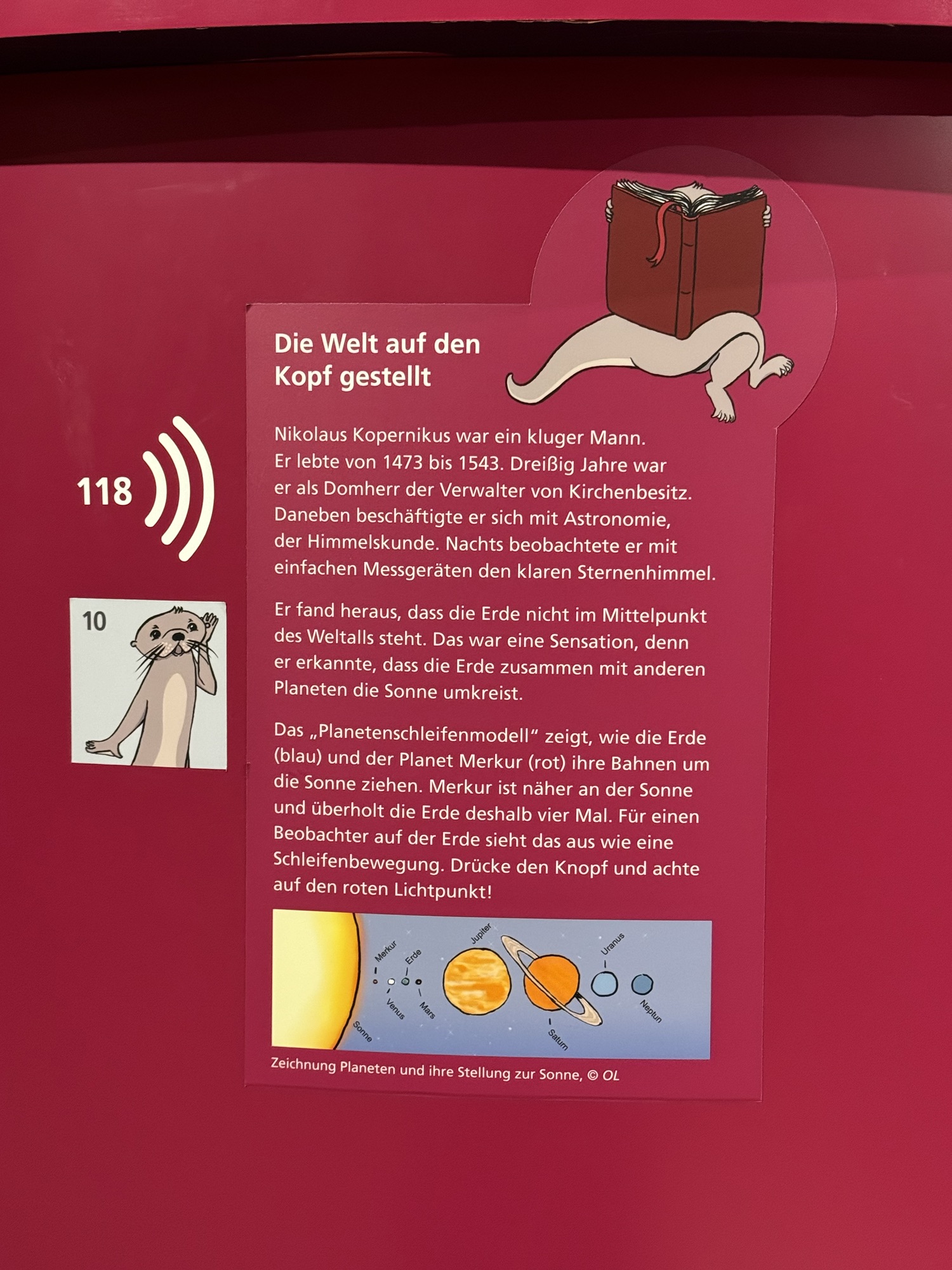 Vom Ordensland zum Herzogtum: Preußens Aufstieg begann zu Beginn des 16. Jahrhunderts. Bis zur Begegnung Luise von Preußens mit Napoleon im Jahre 1807 ist es ein kleiner Zeitsprung, es lohnt sich dennoch, diese Episode genauer unter die Lupe zu nehmen. Es folgt ein weiterer Abstecher in die Tierwelt, denn Ostpreußen ist auch bekannt für die Trakehner, der ältesten Reitpferderasse Deutschlands. Wenn Du immer schon mal eine Kirchenglocke aus der Nähe sehen oder gar selbst läuten wolltest, nimm den Weg durch den Filzvorhang zum Bereich „Glocken – Christentum für Anfänger“. Seit der Reformation hatte Preußen eine überwiegend evangelische Bevölkerung und galt im Vergleich zu den katholischen Nachbarstaaten als relativ liberal. Ein kurzer Exkurs in die Welt der Astronomie, denn auch Kopernikus war Preuße. Ein interaktives Modell zeigt, wie die Erde die Sonne umkreist. Für Kinder – und junggebliebene Erwachsene – erklärt übrigens Fischotter Ingo auf entsprechenden Schautafeln komplexere Zusammenhänge.