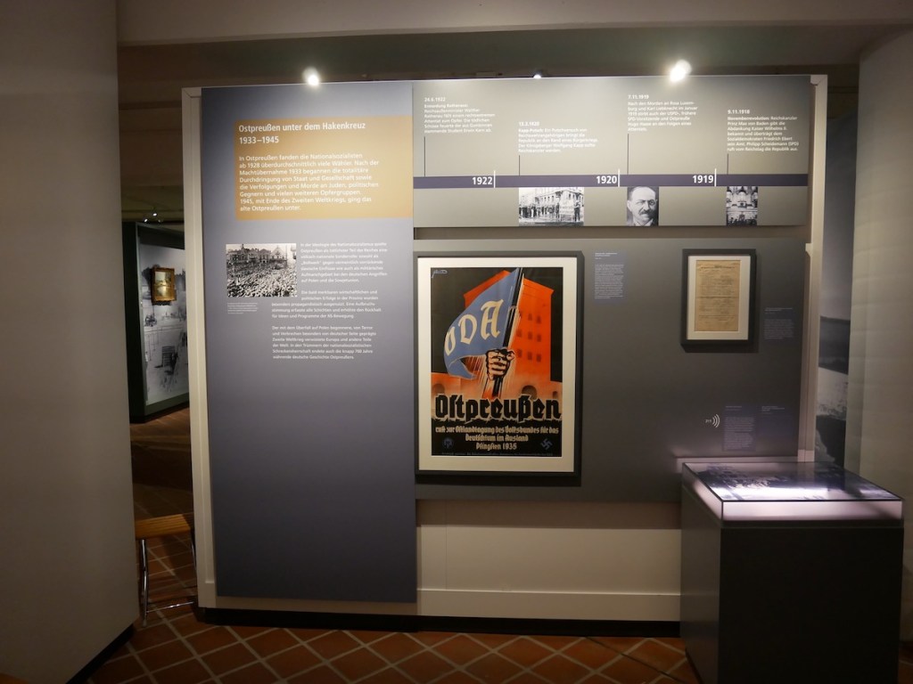 Dennoch – und auch das macht die Ausstellung deutlich – darf die Geschichte der Eroberung Ostpreußens und der Vertreibung der deutschen Bevölkerung nicht als reine Opfergeschichte verstanden werden. Die Zeit des Nationalsozialismus wird ebenso intensiv behandelt und die deutschen Verbrechen werden vorbehaltlos abgebildet. Hier kommen beispielsweise auch verfolgte jüdische Ostpreußen und ostpreußische Sinti als Zeitzeugen zu Wort.